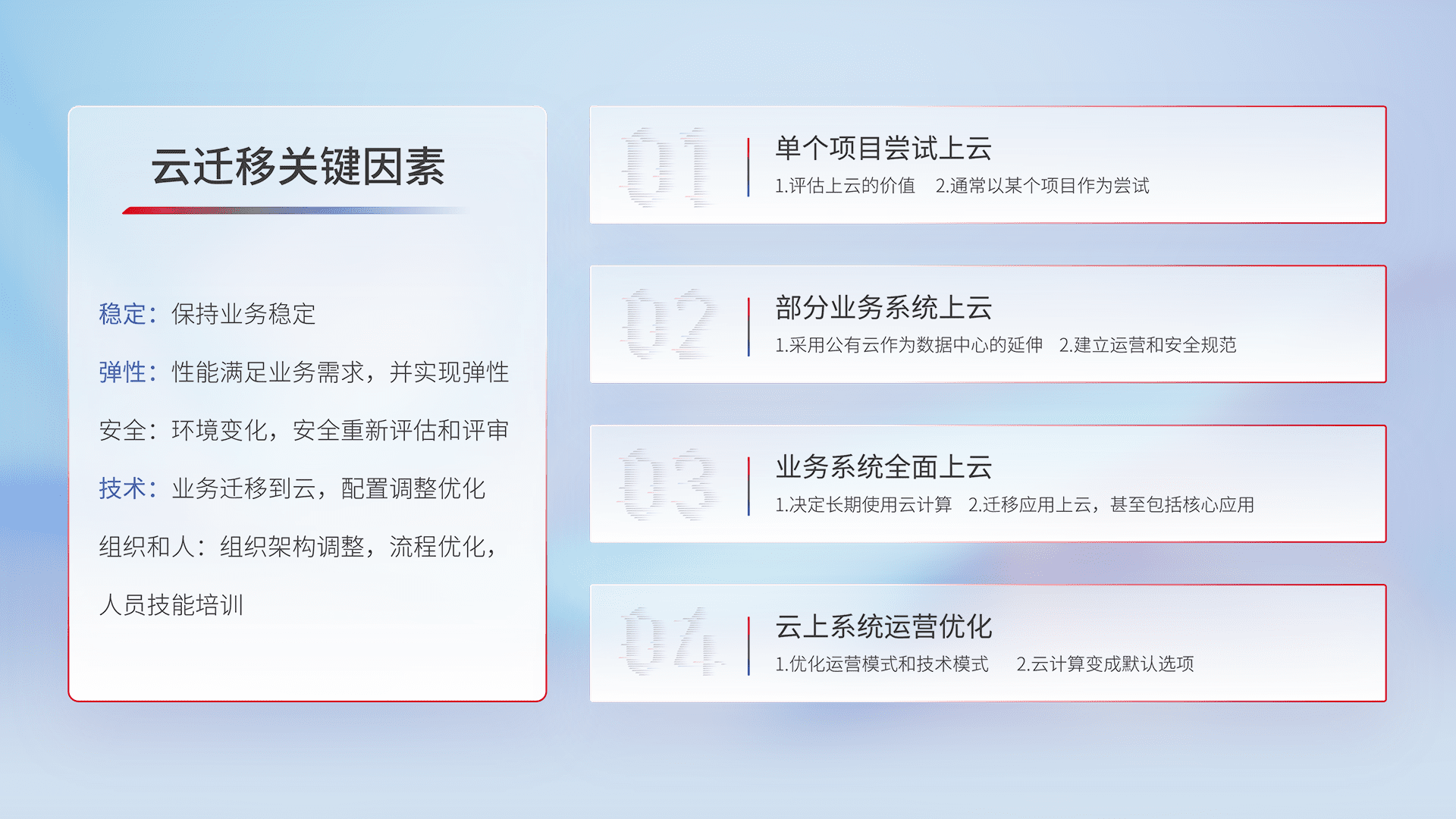 结合实际业务,,,从规划设计、、、云平台选型、、、、云原生改造、、、、数据迁移、、、集成交付,,,,迁移全过程为客户识别最佳上云路径,,做好风险识别管理,,设计网络架构、、、、身份权限、、、、安全审计合规、、、、操作审计、、日志审计、、监控告警策略、、、多站点容灾设计等,,,,对云上基础设施进行整体规划,,,,提升IT治理水平,,以满足弹性、、、高可用、、高性能的需求。。。。
